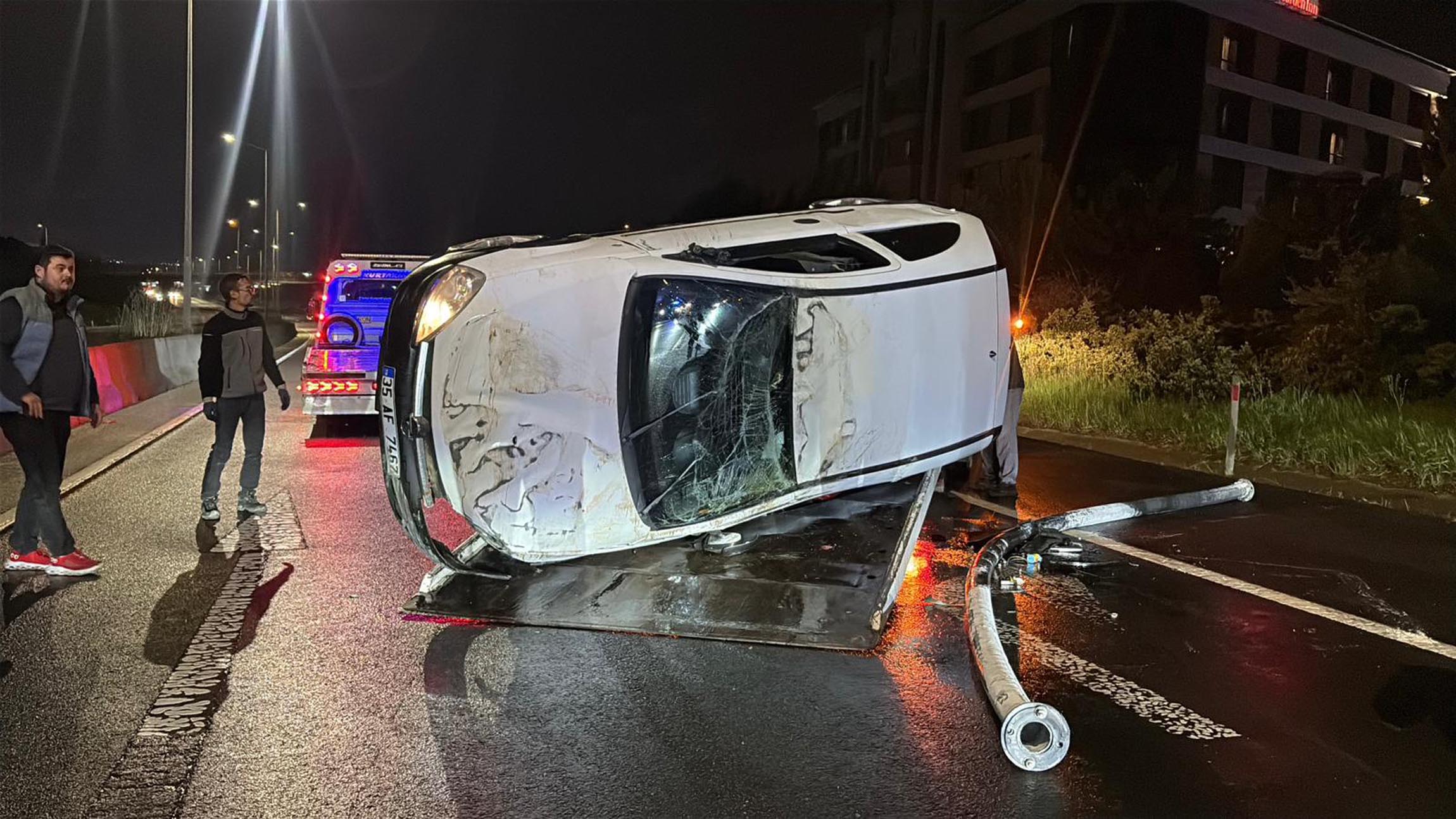 Kazada ters dönen otomobil polis ve vatandaşların yardımıyla düzeltilerek çekiciye yüklendi.