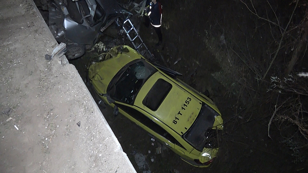 Kaza, saat 02.30 sıralarında Kalıcı Konutlar bağlantı yolunda meydana geldi. Ahmet Kurt’un makas attığı 81 T 1153 plakalı taksi, Muhammed Sargın yönetimindeki 81 AG 666 plakalı otomobile çarptı. Çarpmanın etkisiyle iki araç köprüden düştü. Kazada, taksi şoförü Ahmet Kurt ile otomobil sürücüsü Muhammed Sargı ve yanındaki Şakir Tütüncü, Zakire Durmaz ve Şevval Canpolat yaralandı.