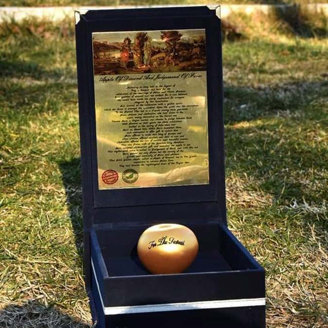 Paris, bu altın elmayı Afrodit’e veriyor. Diğer iki tanrıça Helen ve Athena buna kızarak Troya’yı yıkacaklarını söylüyorlar. Altın elmanın anlaşmazlık elması olarak da anılması en güzelin kim olduğu konusundaki anlaşmazlıktan geliyor. Bu nedenle elmanın üzerindeki ‘en güzele’ ifadesi önemli ve biz de hediyelik altın elmaların üzerinde bu yazıyı kullandık. Troya efsanesinin başlamasına sebep olan altın elma ile hem ülkemizde hem de dünyada tanıtım anlamında önemli bir aşama kaydedeceğimizi düşünüyoruz” dedi.