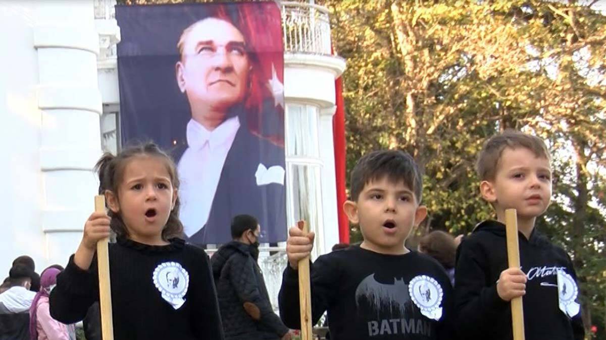 Gazi Mustafa Kemal Atatürk’ün vasiyetini yazdığı Atatürk Köşkü’nü ölümünün 83’üncü yıl dönümü dolayısıyla ziyaret eden Yeni Dünya Ortahisar Eğitim Kurumları öğrencileri, ‘10 Kasım‘ şarkısını ellerindeki çubuklarla ritim tutarak seslendirdi.