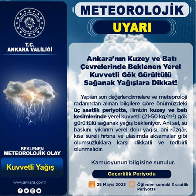 Ankara Valiliği kuvvetli sağanak beklendiğini belirterek, yaşanabilecek olumsuzluklara karşı vatandaşları uyardı.