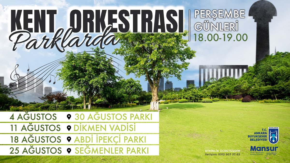 Başkentin prestij parklarında ve Ankara Kalesi’nde düzenlenecek etkinlikler kapsamında Kent Orkestrası müzikseverler için çalacak. Ağustos ayı boyunca her çarşamba ve perşembe günleri 18.00-19.00 saatleri arasında, her salı ve cuma günleri 17.30-18.30 arasında ise Ankara Kalesi’nde Fomget ve Mehter Takımı ile birlikte verilecek ücretsiz konser programı şöyle: