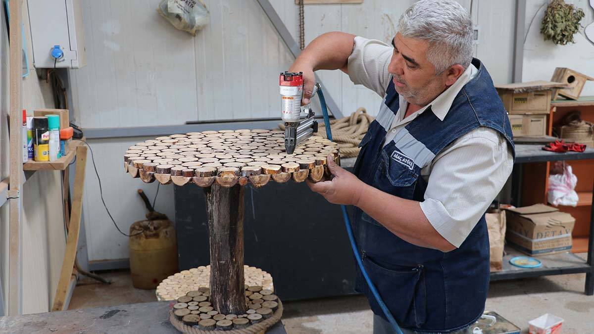 Hamit Ertürk, Ankara’da uzun yıllardır atık ağaçların toplanarak atölyeye getirildiğini söyledi. Her ağaç üzerinde farklı tasarım yaptıklarını belirten Ertürk, “Atık ağaçlardan çocuk oyun grupları, sokak hayvanları için kulübeler ve kent mobilyaları elde ediyoruz. Kuş evleri, saksılar ile hayvan figürlü kütükler de var. Mesela masa sandalye takımı bir haftamızı aldı. Ankara halkı, bunları çok beğendi. Buraya gelen vatandaşlarımız var. Burada kurs görmek isteyenler var. Burası herkese açık. Ne ağaçlar ne eser çıkıyor onları görebilirler” diye konuştu.