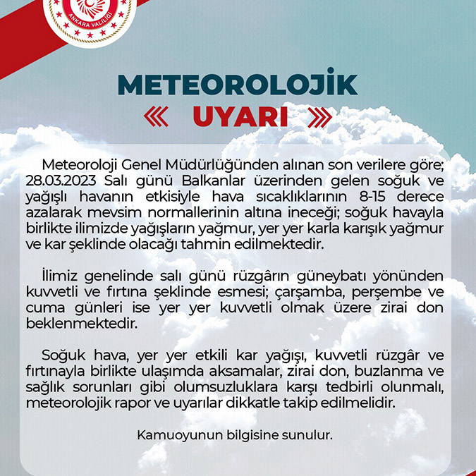 Valiliğin Twitter hesabından yapılan açıklamada, “Meteoroloji Genel Müdürlüğünden alınan son verilere göre; 28 Mart 2023 Salı günü Balkanlar üzerinden gelen soğuk ve yağışlı havanın etkisiyle hava sıcaklıklarının 8-15 derece azalarak mevsim normallerinin altına ineceği; soğuk havayla birlikte ilimizde yağışların yağmur, yer yer karla karışık yağmur ve kar şeklinde olacağı tahmin edilmektedir.