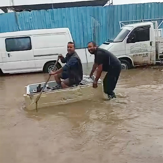 Serik Sanayi Sitesi’nin bazı bölümlerinde yağış nedeniyle su birikintileri oluştu. Bazı vatandaşlar eski bir buzdolabını tekneye dönüştürerek, kürek çekerek suda ilerlemeye çalıştı. Cep telefonu ile bu anları görüntüleyen kişilerin “Burada kaldık, AKUT’u arayın, yardım edin” dediği duyuldu.