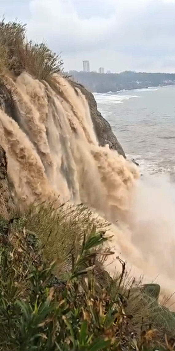 Sağanak sonrası, şiddetli akan Düden Şelalesi’nin rengi de kahverengiye döndü. Muratpaşa ilçesi Lara bölgesinden denize dökülen şelalede, tersten gelen rüzgar şelale sularını deniz yerine karaya savurdu. Şelalenin denizle buluştuğu noktaya gelenler, çamur gibi akan suyu görünce şaşkınlık yaşadı. Çamurlu su deniz üzerinde de kahverengi tabaka oluşturdu.