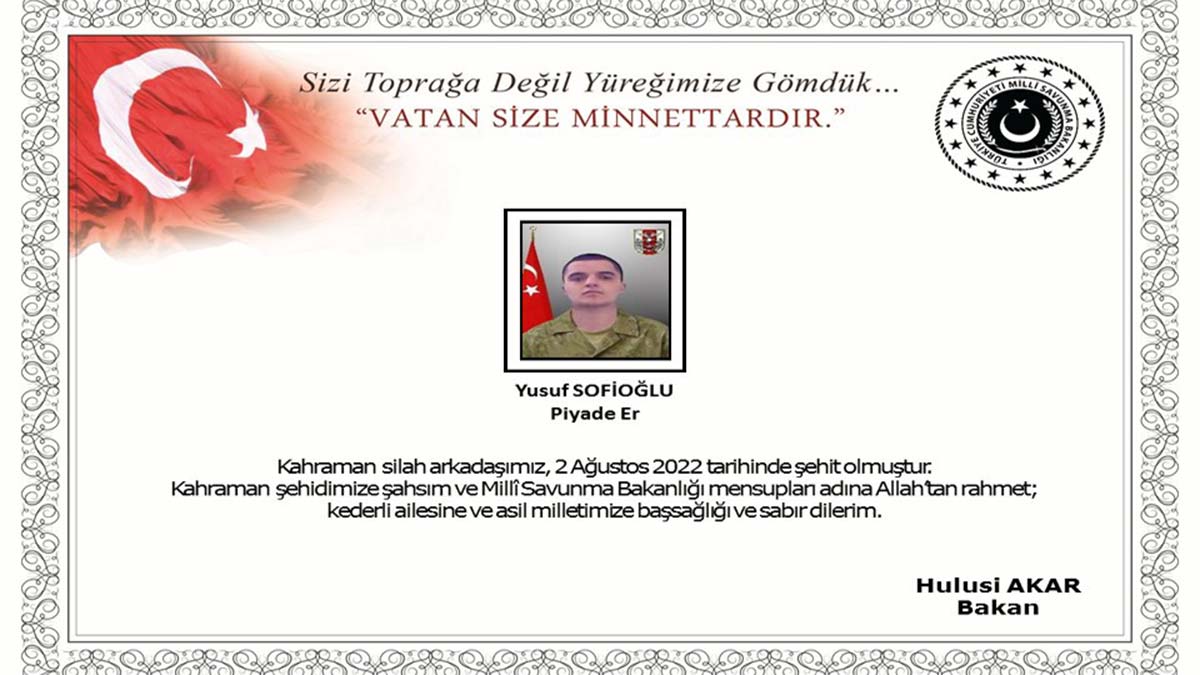 Bakanlıktan yapılan açıklamada, “Altınözü Hatay hududunda, 29 Temmuz 2022 tarihinde araç kazası sonucu yaralanarak hastaneye sevk edilen kahraman silah arkadaşımız Piyade Er Yusuf Sofioğlu, yapılan tüm müdahalelere rağmen kurtarılamayarak 2 Ağustos 2022 tarihinde şehit olmuştur. Bizleri derin bir acı ve üzüntüye boğan bu olayda hayatını kaybeden aziz şehidimize Allah’tan rahmet, kederli ailesine, Türk Silahlı Kuvvetleri (TSK) ile asil milletimize başsağlığı ve sabır dileriz” denildi.