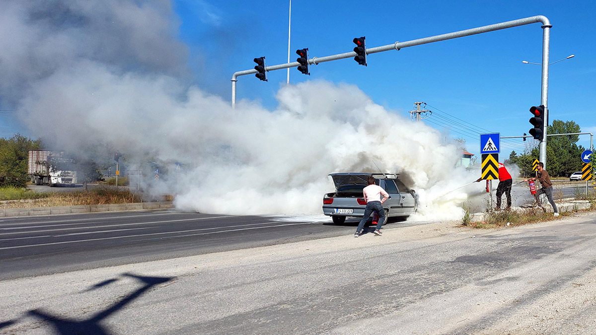 Bolu’da D-100 kara yolunun Kuruçay mevkisinde Ankara yönüne giden İsmail Tarım yönetimindeki 14 AAE 228 plakalı otomobil, seyir halindeyken motor kısmından alev aldı. Yangını fark eden çift, aracı durdurup indi. Çevredekiler alevlere yangın söndürme tüpleriyle müdahale etti. İhbar üzerine bölgeye sevk edilen ekipler, yangını kısa sürede söndürdü. Çiftin yanışını uzaktan izlediği araç, kullanılamaz hale geldi.
