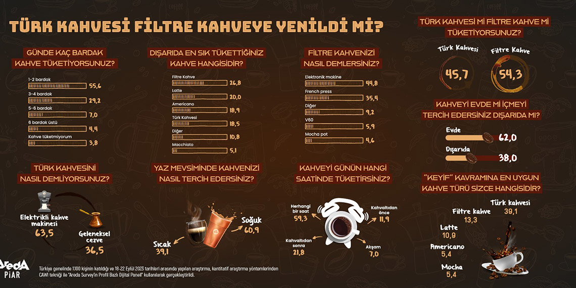 Araştırmaya göre tüketicilerin yüzde 54,3’ü filtre kahvenin, yüzde 45,7’si Türk kahvesinin tarafını tutuyor. Kahveyi tüketicilerin yüzde 44,8’i elektronik makine, yüzde 35,4’ü French Press, yüzde 5,9’u V60, yüzde 4,6’sı Mocha Pot ile demlediğini belirtiyor. Yüzde 9,2’si ise diğer seçeneğinde bir araya geliyor.