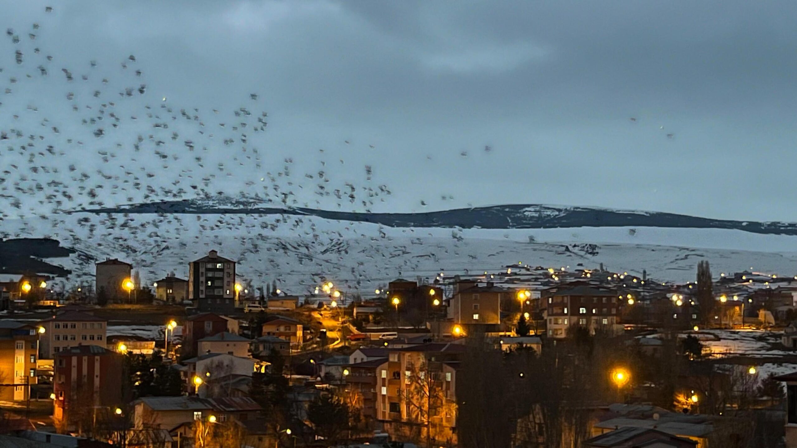 Ardahan kent merkezinde dün akşam saatlerinde ortaya çıkan binlerce karga, gökyüzünü adeta siyaha bürüdü.