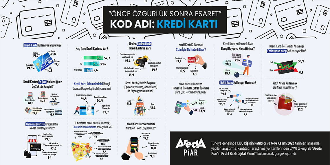 Araştırma şirketi Areda Piar, Türkiye genelinde bin 100 kişinin katılımıyla kredi kartı araştırması gerçekleştirdi. Araştırmada kredi kartı kullanıcılarının yüzde 77,1’i kullanım sebebini bir ‘zorunluluk’ olarak görürken ve yüzde 39,6’sı ‘önce özgürlük sonra esaret’ şeklinde tanımlıyor.