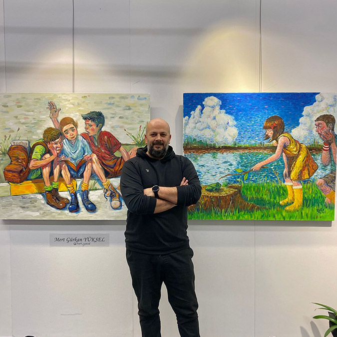 Yaklaşık 27 yıldır sanatla uğraştığını belirten ressam Mert Gürkan Yüksel, “Çocukluğumuzda en sevdiğimiz oyun, annemizin duvara çaktığı dev kağıtlar üzerine resim yapmaktı. Bu benim sanat hayatımın başlangıcıydı. Resim yaparken kendi çocukluğuma atıfta bulunmayı seviyorum. Sanatımla günümüz çocuklarının mahrum kaldığı ‘Çocukluğu’ yeniden canlandırıyorum. Buradaki eserlerimin çoğu çocukluğumda ve hayatımda yaşadığım konulardan oluşuyor. Örneğin; Marmaris’te gittiğimiz bir tatil, arkadaşlarımla sokakta oyun oynamak veya aile pikniklerimiz gibi.. Sanatımın insanları mutlu ederken biraz da nostalji yaşatmasını istiyorum. Bu sebeple de eserlerimde canlı renkleri ve neşeli anları konu ediyorum” dedi.
