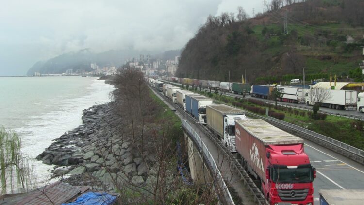 Türkiye’nin Kafkas ülkelerine açılan Artvin’in Sarp Sınır Kapısı’ndan Gürcistan’a geçebilmek için TIR kuyruğunda sıra bekleyen şoförler, yol kenarında kurdukları iftar sofrasında oruçlarını açtı.
