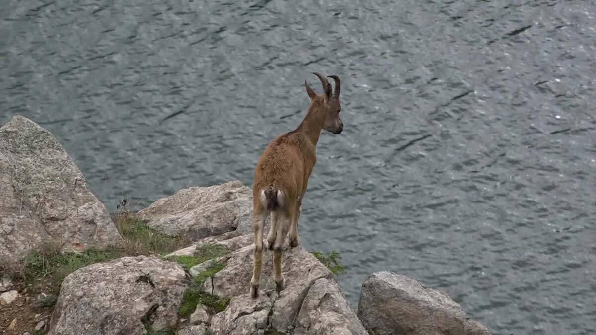 Artvin’de Deriner Barajı’nın kenarındaki kayalık arazideki yaban keçileri görüntülendi