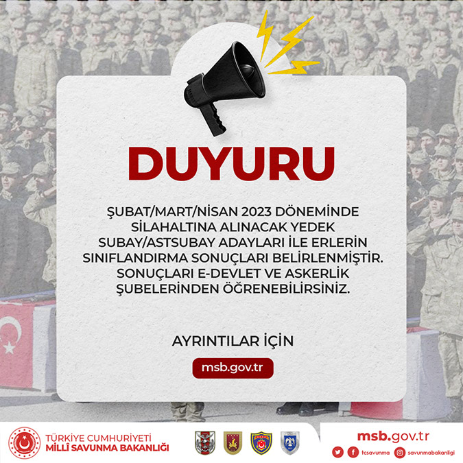 Bakanlığın Twitter’daki hesabından yapılan açıklamada, “Şubat, Mart, Nisan 2023 döneminde silahaltına alınacak yedek subay, astsubay adayları ile erlerin sınıflandırma sonuçları belirlenmiştir. Sonuçları e-Devlet ve askerlik şubelerinden öğrenebilirsiniz” denildi.