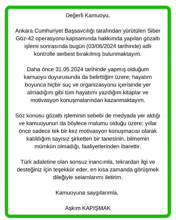 Yazar Aşkım Kapışmak’ın, Ankara merkezli 21 ilde “Smart Trade Coin” isimli sözde kripto varlık alım/satım platformu üzerinden “Sıfır Risk İle Yüksek Kazanç” vaadiyle nitelikli dolandırıcılık suçunu işleyen şahıslara yönelik düzenlenen “Sibergöz-42” operasyonları kapsamında İstanbul’da gözaltına alınmış ve soruşturmanın yürütüldüğü Ankara’ya götürülmüştü.