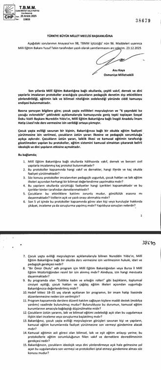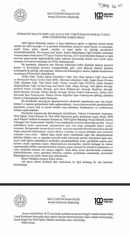 CHP Kadın Kolları Genel Başkanı ve Osmaniye Milletvekili Asu Kaya’nın Milli Eğitim Bakanlığı’nın vakıf ve derneklerle yaptığı iş birliklerine ilişkin soru önergesine Milli Eğitim Bakanı Yusuf Tekin yanıt verdi.