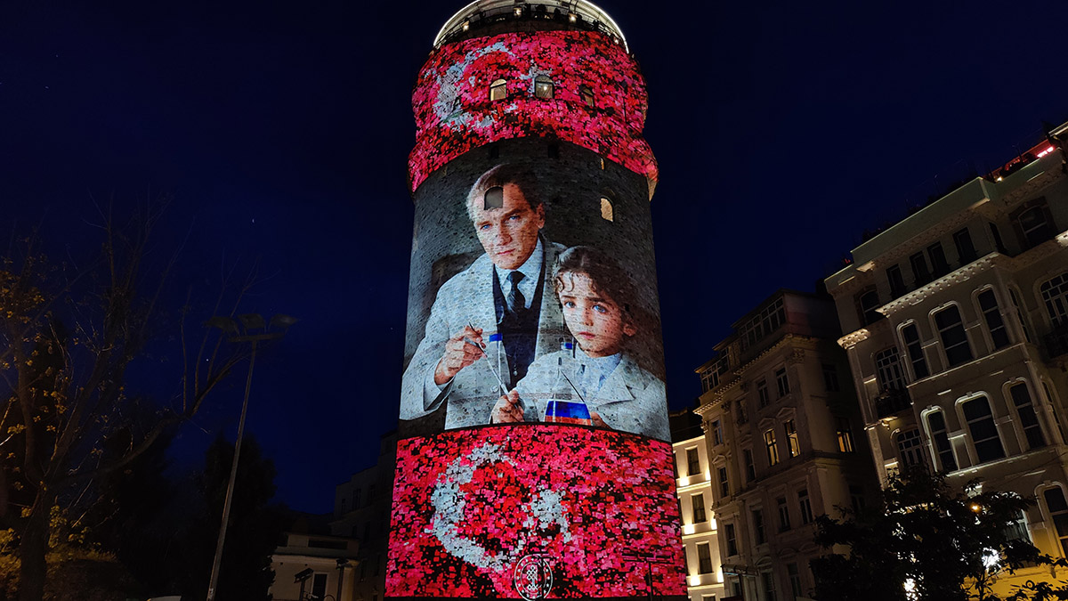 Kültür ve Turizm Bakanlığı tarafından düzenlenen “Bir Hayalin İnşası” Dijital Enstalasyon sergisi Beyoğlu’nun simgesi olan Galata Kulesi’nde İstanbullularla buluştu. Cumhuriyet Müzesinin arşivinde bulunan Cumhuriyetin Kurucusu Büyük Önder Mustafa Kemal Atatürk’e ait fotoğraflar Galata Kulesi’ne yansıtıldı. Yapay zeka ile oluşturulan Atatürk heykeli “Dünyada çocuklara bayram armağan eden tek lider Atatürk’ü saygıyla anıyoruz” notuyla paylaşıldı. Gösteride, Mustafa Kemal Atatürk’ün çocuklarla olan fotoğrafları yoğun ilgi gördü.