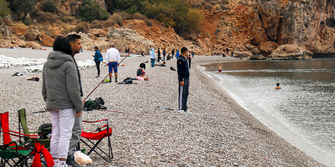 Sabah erken saatlerde Konyaaltı Sahili’nde denize girenler ve balık tutanlar da Ata’ya saygı duruşunda bulundu. Sup board (kürek sörfü) yapan sporcuların bazıları board üzerinde ayağa kalkıp beklerken yüzen vatandaşlar da sahilde saygı duruşunda bulundu. Varyantlardaki dev Türk bayrağı da yarıya indirildi.