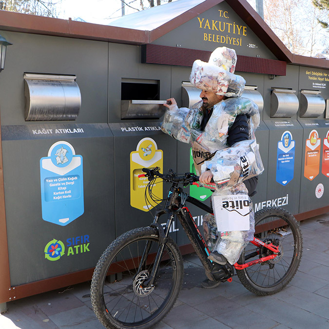 Erzurum Atatürk Üniversitesi Mühendislik Fakültesi Çevre Mühendisliği Bölümü yüksek lisans öğrencisi Melikşah Tekin (35), geri dönüşümün önemine dikkat çekmek amacıyla, 1 ayda biriktirdiği atıklardan çöp elbise tasarladı.