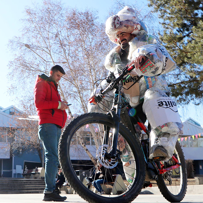 Geri dönüşüm konusunda farkındalık sağlamayı amaçladığını söyleyen Tekin, “Bir aydır tüketimini sağladığım tüm çöplerimi biriktirip, bunları üzerime kıyafet yaptım. Doğaya vereceğim yükü kendim taşımak istedim. Aslında üzerimdeki her şey geri dönüşümle ham maddeye dönüşüp yeniden ekonomiye kazandırılabilir. Hepimiz bu kadar çöpü doğanın sırtına yükleyerek aslında geleceğimizi yok ediyoruz. Siz de çöplerinizi doğanın sırtından alın ve ekonomiye kazandırın. Bu anlamda belediyelerimiz 50 noktaya bu atıkların geri dönüşüme kazandırılması için çöp konteynerleri bırakmış ama maalesef bunların kapağını açan yok gibi. Herkes her maddeye çöp gözüyle bakıyor” diye konuştu.