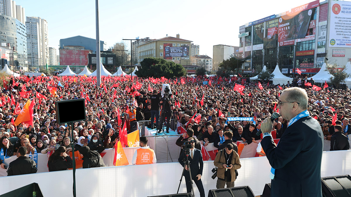Meydanı dolduranlara seslenen Cumhurbaşkanı Erdoğan, “Şimdi geliyor 2023. Hazır mıyız? Sandıkları patlatıyor muyuz? Cumhur İttifakı olarak, el ele, omuz omuza sandıkta da yürüyor muyuz? Artık vakit yok. Artık sayılı haftalardayız. Ben size inanıyorum, siz de bize inanıyorsanız Allah’ın izniyle bu işi başarırız” dedi.