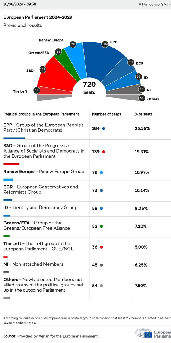 Avrupa Birliği parlamento seçimlerinde bu sabah itibariyle yayınlanan ‘geçici sonuçlara’ göre merkez sağ Avrupa Halk Partisi Birliği (EPP), 720 koltuğun 184’ünü aldı.