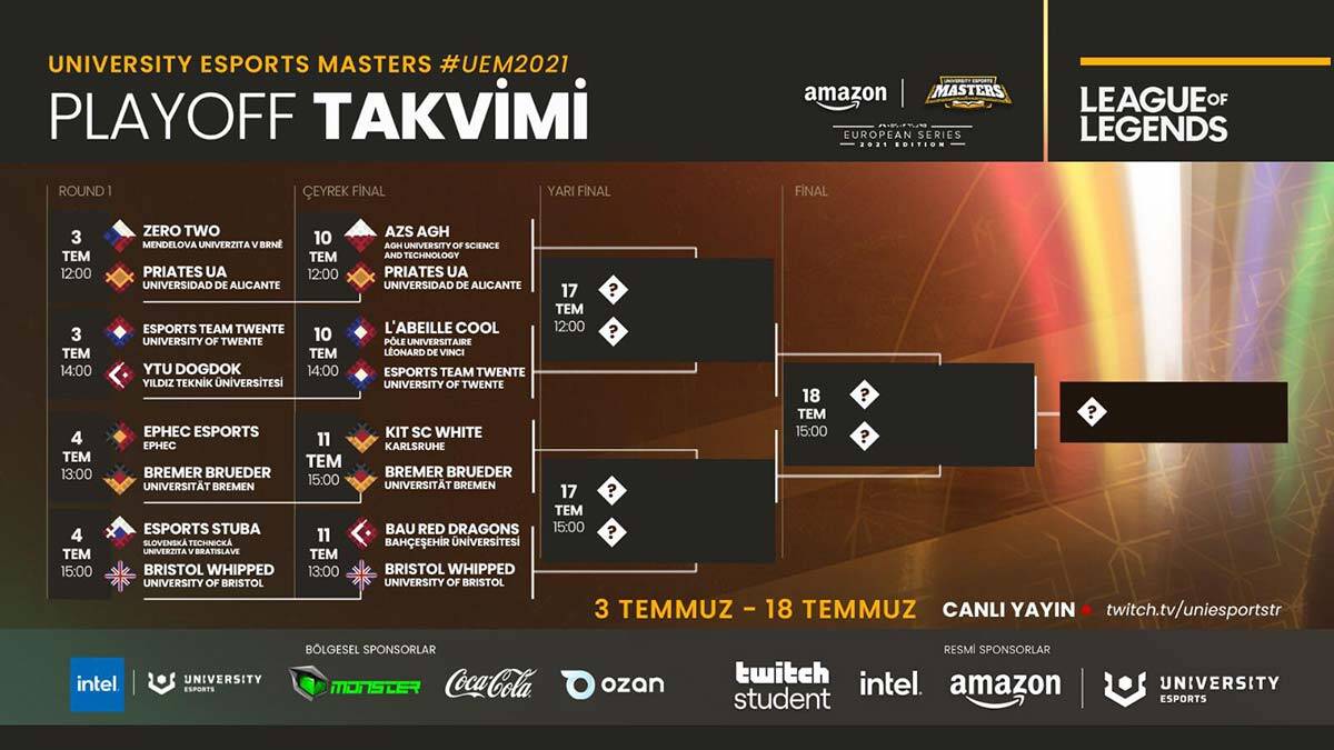 Üniversiteler arası düzenlenen Avrupa şampiyonası UEM 2021, rekor bir katılım ile 16 ülkeden 857 üniversiteyle grup elemeleri şeklinde başlamıştı. 64 takım ve 320 oyuncunun ter döktüğü ‘University Esports Turkey Turnuvası’nın şampiyonu olan Bahçeşehir Esports Red Dragons takımı, katıldığı Avrupa turnuvasında da grup lideri olarak playoff’lara yükseldi. D grubunda Avrupa üniversitelerine karşı mücadele veren ekip, oynadığı 8 maçın 7’sini galip tamamlayarak çeyrek finale yükseldi. Takım, çeyrek finalde Birleşik Krallık temsilcisi Bristol Whipped takımıyla karşılaşacak. Dijital ortamda oynanacak turnuva, grup elemelerinin ardından 10 ülkeden 16 takım ile gerçekleştirilecek.