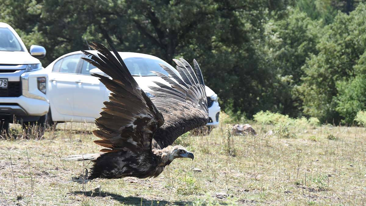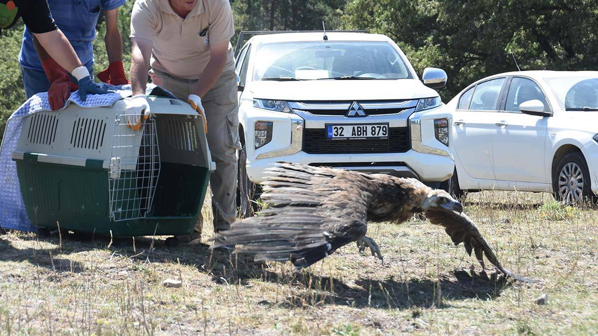 Eskişehir’in Sivrihisar ilçesinde bir süre önce bitkin bulunan kara akbaba, ihbar üzerine bölgeye giden Doğa Koruma ve Milli Parklar Eskişehir Şubesi ekiplerince alınarak tedavi için Eskişehir Büyükşehir Belediyesi Hayvanat Bahçesi’ne götürüldü. Burada veteriner hekimler tarafından tedavisi sağlanan, Avrupa’nın en yırtıcı kuşu kara akbaba, ormanlık alanda doğaya salındı. Özel koruma kutusuyla ormana getirilen ve yaklaşık 7 kilo ağırlığındaki kara akbaba, özgürlüğe birkaç adım attıktan sonra 3 metreyi bulan kanatlarını açıp gökyüzüne süzüldü.