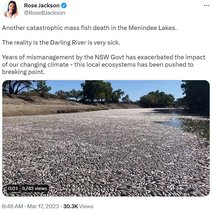 Yeni Güney Galler eyaletinin Menindee kentindeki Darling Nehir’de dün milyonlarca balık ölümü meydana geldi, nehir yüzeyi neredeyse tamamen ölü balıklarla kaplandı. Havzada bulunan diğer akarsu ve nehirlerde de ölü balıkların yerel halk tarafından görülmesi üzerine yetkililer, dün açıklama yaparak geniş çaplı ölümlerin meydana geldiğini doğruladı. Yeni Güney Galler Birincil Endüstriler Kurumu’nun (NSW DPI) yetkilileri açıklamada “Çoğunluğu Kemikli Ringa Balığı (Kemikli Çipura) olmak üzere milyonlarca balığın etkilendiği tahmin edilmektedir” ifadelerini kullandı.