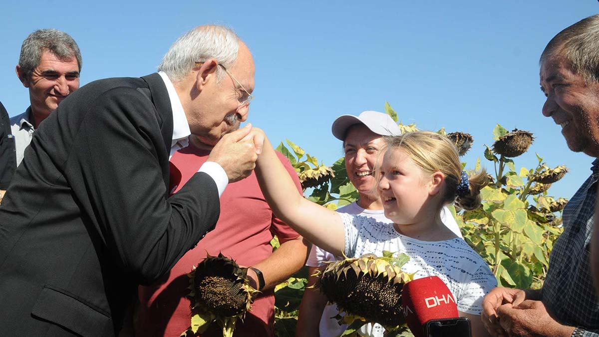 CHP Genel Başkanı Kemal Kılıçdaroğlu, Edirne’de ayçiçeği tarlasında çiftçilerle bir araya geldi. Kılıçdaroğlu, “Ayçiçeği taban fiyatı ton başına 16 bin lira olmalı” dedi.
