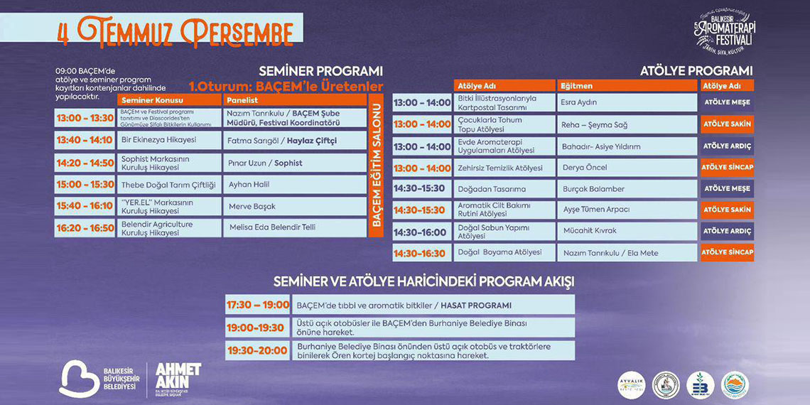T.C. Balıkesir Büyükşehir Belediye Başkanlığı Çiftçi Eğitim Merkezi (BAÇEM) bünyesinde Burhaniye ilçesi Ören Mahallesinde 5. Aromaterapi Festivalini düzenleyecek.