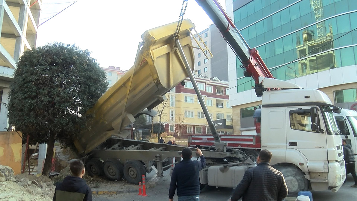 Bağcılar’da inşaat alanına kum getiren hafriyat kamyonunun damperi devrildi. Damper yaklaşık bir buçuk saatlik çalışmanın ardından kaldırıldı.