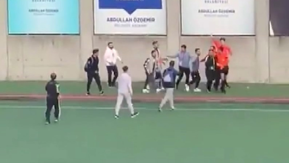 Bağcılar’da amatör lig maçında hakeme saldırı gerçekleşti. O anlar cep telefonu kamerası tarafından görüntülendi.