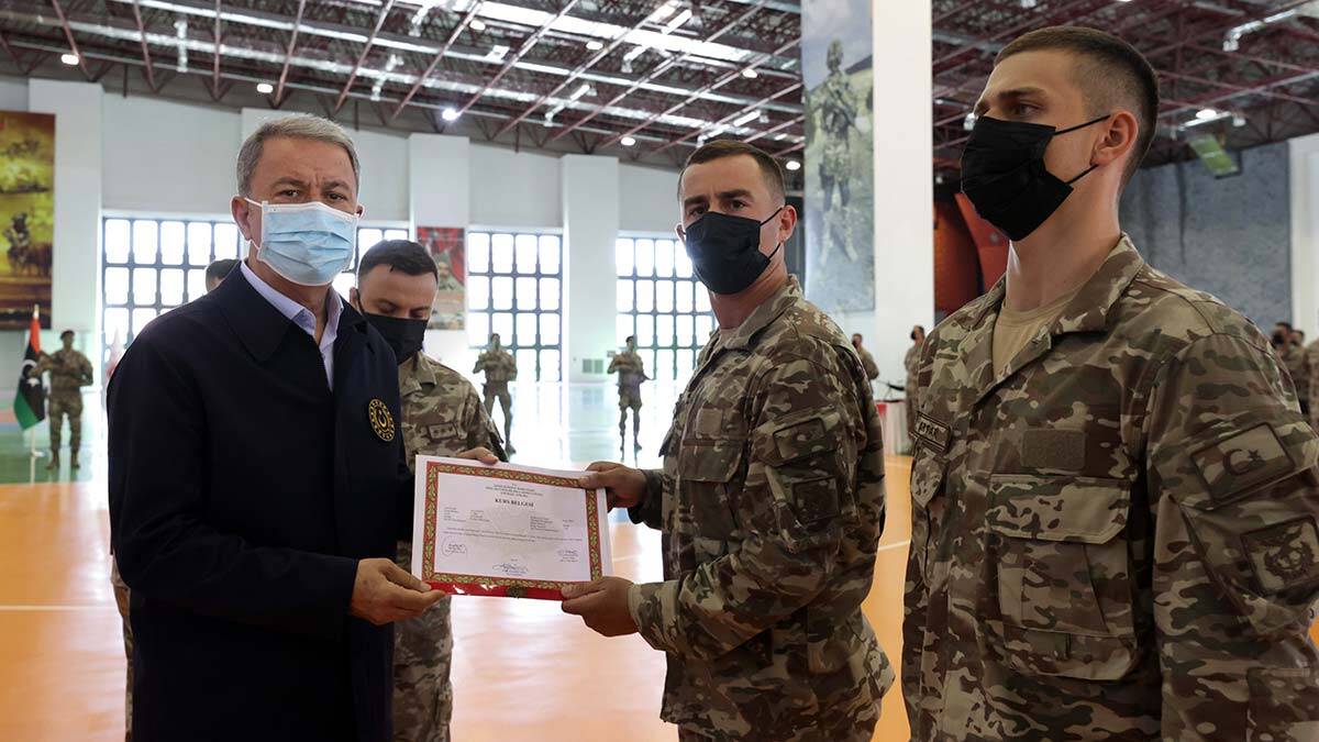 Bakan Akar, Türkiye’nin Libya ve Azerbaycanlı kardeşlerinin haklı davalarında yanlarında olmaya devam edeceğini belirterek, “Libya’da biz ‘yabancı asker’ değiliz. Hükümetin daveti üzerine oradaki faaliyetlerimizi sürdürüyoruz. Orada yapmaya çalıştığımız şey askeri, eğitim iş birliği ve danışmanlık. Diğer ülkelerin çeşitli görevlerde yaptıklarının aynısı fakat biz olduğumuz için bunu anlamamakta ısrar ediyor, bunu karalamak için ellerinden gelen gayreti gösteriyorlar. Bunların hiçbir kıymetiharbiyesi yok. Libyalı kardeşlerimizle beraber olmaya, tek Libya olarak yapmaları gereken çalışmalarda onları desteklemeye devam edecek, bunu sürdüreceğiz. Libya, Libyalılarındır, bunu destekliyoruz” dedi.