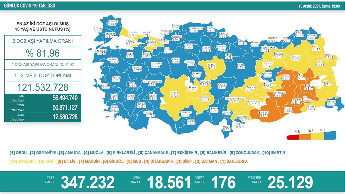 En az 2 doz aşı olan kişi sayısının en yüksek olduğu iller; Ordu, Osmaniye, Amasya, Muğla, Kırklareli, Çanakkale, Eskişehir, Balıkesir, Zonguldak ve Bartın olurken, 2 doz aşı yapılan kişi sayısının en az olduğu iller ise Şanlıurfa, Batman, Siirt, Diyarbakır, Muş, Bingöl, Mardin, Bitlis, Ağrı ve Bayburt oldu.