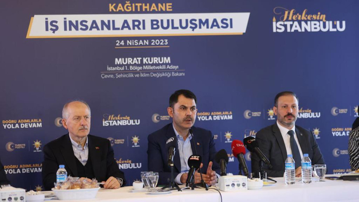 ‘Kâğıthane İş Dünyası Buluşması’na katılan Çevre Şehircilik ve İklim Değişikliği Bakanı Murat Kurum, “Bir tarafta 100 yılda yapılacak işleri 21 yıla sığdıran bir irade olan Cumhurbaşkanımız Recep Tayyip Erdoğan var. Diğer tarafta ise bu ülkenin geleceğine dair projesi olmadığı gibi; yatırımcıyı tehdit eden bir Kılıçdaroğlu var” dedi.