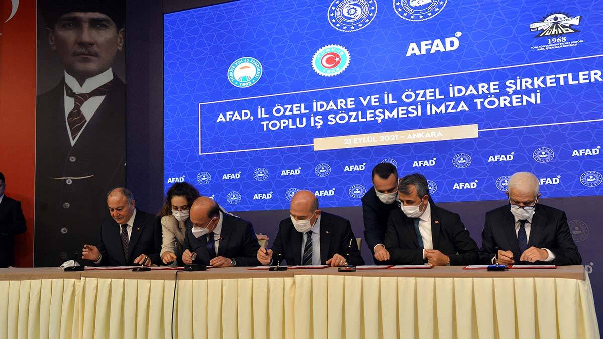 İçişleri Bakanı Süleyman Soylu ile Çalışma ve Sosyal Güvenlik Bakanı Vedat Bilgin, ‘AFAD, İl Özel İdare ve İl Özel İdaresi Şirketleri Toplu İş Sözleşme İmza Töreni’ne katıldı. AFAD’da düzenlenen törende AFAD Başkanı Yunus Sezer ile çalışanlar da yer aldı. Törende konuşan Bakan Soylu, sözleşmenin hayırlı olmasını dileyerek, çalışanların selde, afette her yerde görev aldıklarını belirterek, teşekkür etti. Türkiye’nin büyüdüğünü söyleyen Soylu, “Devletimiz ve milletimiz zenginleşiyor, daha da zenginleşecek. Daha güçlü bir noktaya ulaşacağız. İnşallah 2023, 2053 ve 2071’de gerek kendi coğrafyasında gerek dünyada parlayan yıldız Türkiye olarak hep birlikte yarınlara taşıyacağız” dedi.