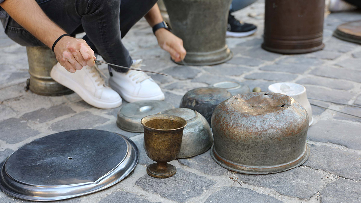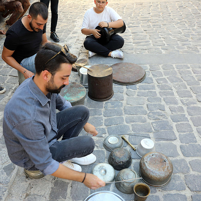 Gaziantep’te yaşayan ritim perküsyon öğretmeni İbrahim Tokmak, öğrencileriyle, kentte yaygın kullanılan bakır mutfak araç gereçlerinden kova, tencere, tas, kepçe ve tepsiyi enstrüman gibi değerlendirerek ritim orkestrası oluşturdu.