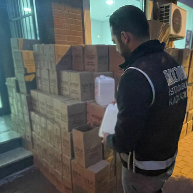 Yapılan çalışmada, şüphelilerin dezenfektan ve yüzey temizleyicisi adı altında etil alkol üretimi yaptıkları, üretimi yapılan etil alkol sıvıların, farklı şehirlerde kaçak alkol üretimi yapan kişilere 5 litrelik bidonlar içerisinde kargo aracılığı ile gönderildiği belirlendi. Ekiplerin düzenlediği operasyonda 2 şüpheli gözaltına alındı. Aramalarda, piyasa değeri 350 bin lira olan 3 ton kaçak alkol ele geçirildi. Gözaltına alınan şüpheliler hakkında adli işlem başlatıldı.