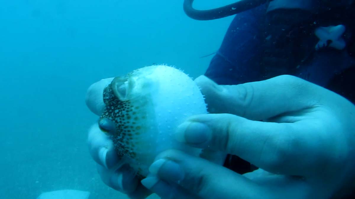 Akdeniz Üniversitesi’nden Prof. Dr. Mehmet Gökoğlu, dipteki besinleri paletle havalandıran dalgıçları takip eden balon balıklarını görüntüledi. Prof. Dr. Gökoğlu, avuçlarına alıp sevdiği türe ‘Şirinler’ adını verdi.