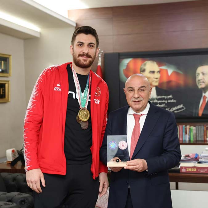 Keçiören Belediye Başkanı Turgut Altınok 24. İşitme Engelliler Yaz Olimpiyat Oyunları’nda (Deaflympics) Ukrayna’yı mağlup ederek şampiyon olan İşitme Engelliler Erkek Voleybol Milli Takımı oyuncularından Mert Karataş ve ailesini makamında misafir etti.