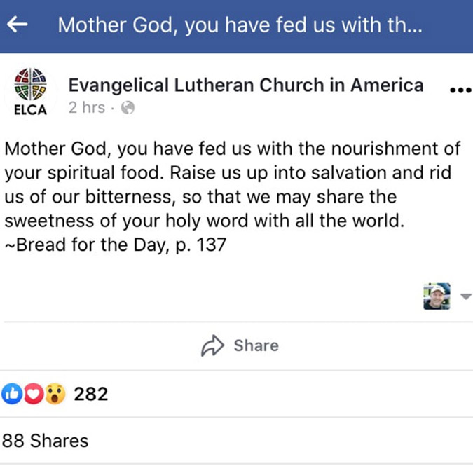 2020 yılında ABD Luteryen Kilisesi(ELCA) tarafından Tanrı’ya “Anne Tanrı” şeklinde hitap edilen bir paylaşım yapılmıştı ki bu Hristiyanlık’taki “Baba Tanrı” figürüne karşı bir terslik oluşturuyordu ve liberal Hristiyanlar tarafından bile yer yer tepki görmüştü.