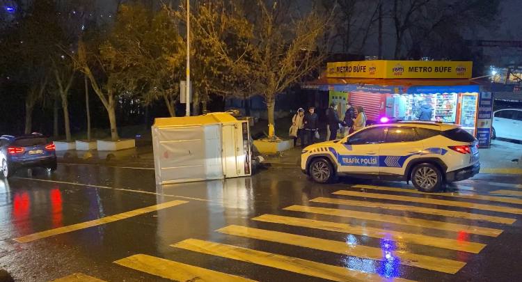 Bayrampaşa’da şoförünün yayalara çarpmamak için manevra yaptığı kamyonet kontrolden çıkarak yan yattı.