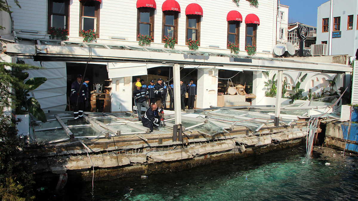 Restoranın yıkılan ve risk teşkil eden bölümü İstanbul Büyükşehir Belediyesi ekipleri tarafından oksijen kaynağı ile kesildi.