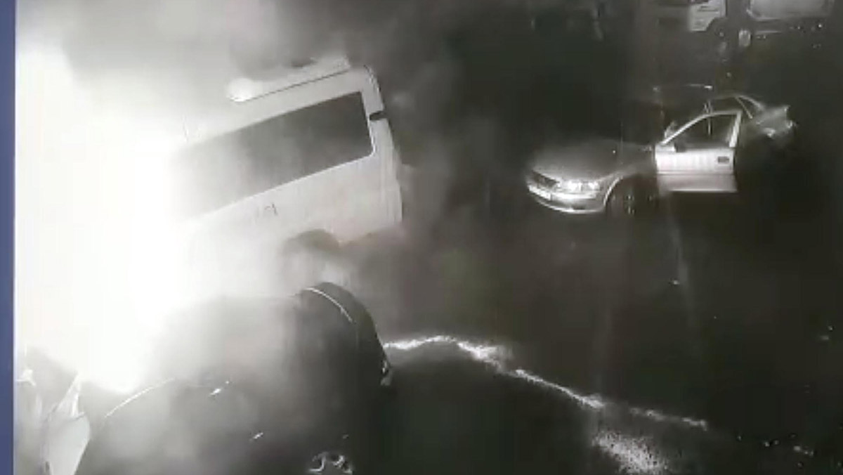 Tekirdağ’ın Ergene ilçesinde, belediyenin minibüsü ile makam aracı yandı. Araçların demir yığınına döndüğü yangın anı, güvenlik kamerasına yansıdı.