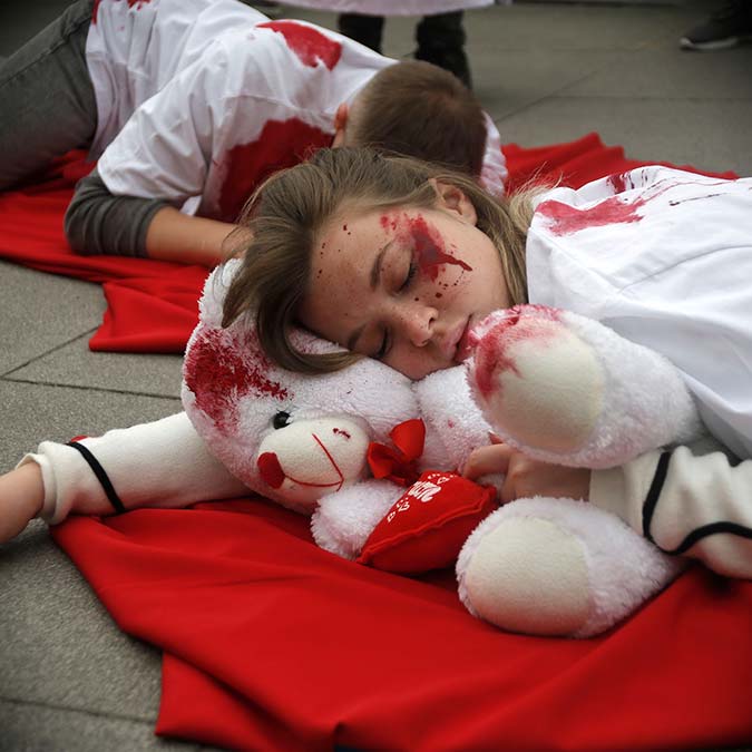 Göstericiler, öldürülen sivilleri temsilen, kan gölünü simgeleyen kırmızı bez üzerinde yerde hareketsiz yattı.