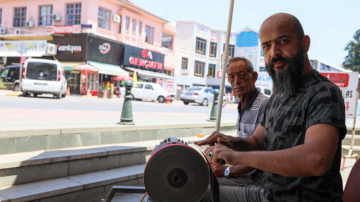 Muratpaşa ilçesindeki Sobacılar Çarşısı’nda, 1875’ten bu yana bıçak ustalığı yapan, Bıçakçılar ailesinin 5’inci kuşak temsilcisi Özen Bıçakçılar ve babası Mustafa Bıçakçılar, Kurban Bayramı öncesi yoğun mesai harcıyor. Bıçak ve satırlarını biletmek isteyenler, üzerlerine isimlerini yazarak bırakıyor. Bıçakları bilemek için dükkan dışında kurdukları tezgahta gün boyu çalışan baba-oğul, 35 dereceyi bulan sıcaklıkta zor anlar yaşıyor. Bayram için 7 bine yakın bıçak bilediklerini ve yoğun tempoda çalıştıklarını aktaran Bıçakçılar, talebin geçen seneye göre azaldığını söyledi.