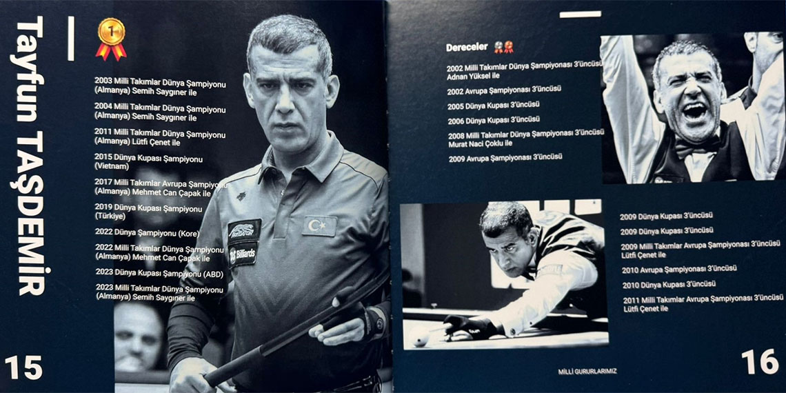 Milli Takım karnesi 65 altın, 45 gümüş ve 101 bronzla göz kamaştıran ‘Türk Bilardo Tarihi’nde, Dünya Şampiyonalarında kazanılan 7 altın, 3 gümüş 14 bronz madalya; Dünya Kupalarında kazanılan 14 altın, 18 gümüş ve 39 bronz madalya; Milli Takımlar Dünya Şampiyonası’nda kazanılan 7 altın, 1 gümüş 6 bronz madalya ve Avrupa Şampiyonalarında kazanılan 34 altın, 19 gümüş ve 40 bronz madalya ve çok sayıda turnuvada elde edilen başarılar bu çalışmayla düzenli bir arşive kavuştu.