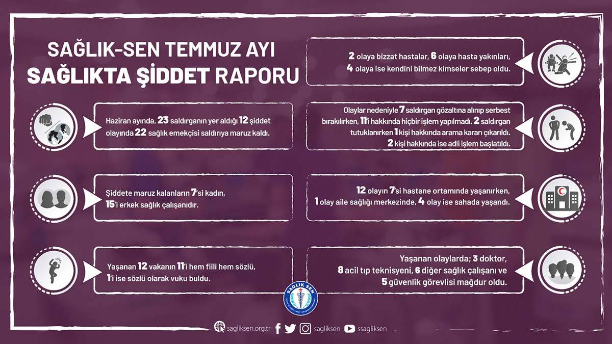 Sağlık-Sen’in ‘Sağlıkta Şiddet Raporu’na göre temmuz ayında sağlık çalışanlarına yönelik 12 şiddet olayı meydana geldiği, 22 sağlık çalışanının mağdur olduğu belirtildi.
